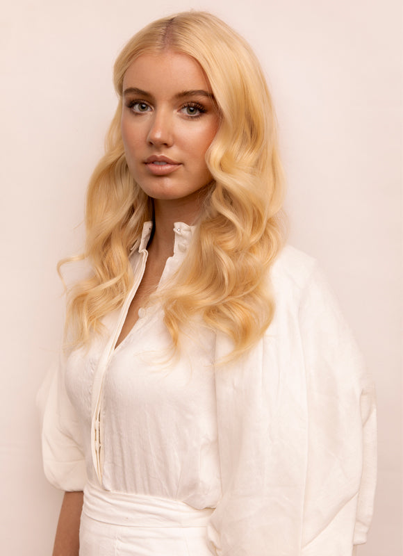 Take your look to the next level with our 16 inch Deluxe Clip-In Hair Extensions in Light Blonde with Strawberry Blonde Highlights. Crafted from the highest grade 100% genuine Remy human hair, these premium extensions provide luxurious length, volume, and a soft, silky finish that blends seamlessly with your natural hair.