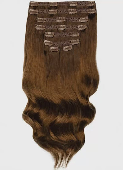 Add instant length, volume, and glamour with our premium 16 inch Full Volume Clip-In Hair Extensions in Dark to Medium Brown Ombre. Crafted from 100% Remy human hair, these extensions are soft, silky, and blend beautifully with your natural hair for a flawless finish.
