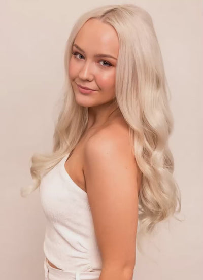 Indulge in the thickest, most luxurious hair extensions we offer — our 16 inch Ultimate Volume Clip-In Hair Extensions in Platinum Blonde. Crafted from double drawn, 100% cuticle-aligned Remy human hair, these premium extensions deliver exceptional thickness from top to ends, a soft, silky feel, and stunning, natural-looking volume.