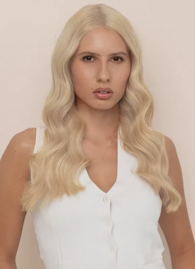 Indulge in the thickest, most luxurious hair extensions we offer — our 16 inch Ultimate Volume Clip-In Hair Extensions in Ice Blonde. Crafted from double drawn, 100% cuticle-aligned Remy human hair, these premium extensions deliver exceptional thickness from top to ends, a soft, silky feel, and stunning, natural-looking volume.