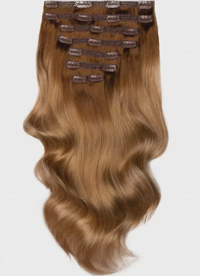 Add instant length, volume, and glamour with our premium 20 inch Full Volume Clip-In Hair Extensions in Medium Brown to Golden Blonde Ombre. Crafted from 100% Remy human hair, these extensions are soft, silky, and blend beautifully with your natural hair for a flawless finish.
