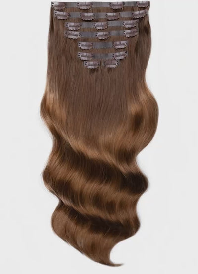 Classic Clip-In Hair Extensions use a traditional stitched fabric weft. While slightly thicker at the seam, they are extremely durable and offer excellent volume and grip, making them perfect for medium to thick hair types.