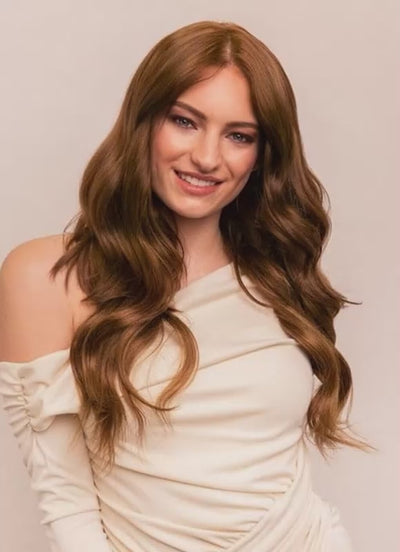 The one piece Halo-style hair extension is designed for quick and easy application — taking about 30 seconds to slip on. Its adjustable, invisible wire ensures a secure fit for any head size, providing the equivalent of a full head of hair. The wire sits comfortably on your crown, hidden beneath your natural hair, making it perfect for daily wear.