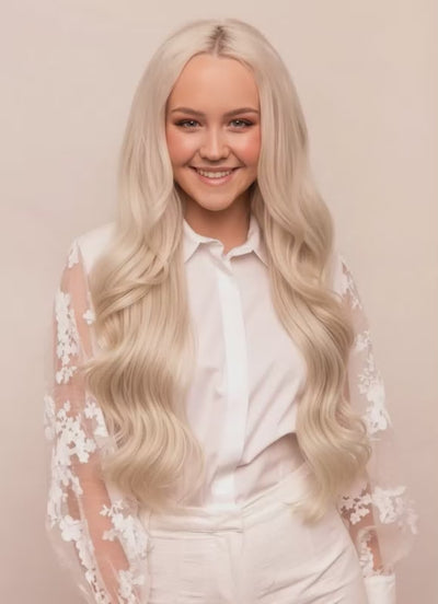 Take your look to the next level with our 24 inch Deluxe Clip-In Hair Extensions in Platinum Blonde. Crafted from the highest grade 100% genuine Remy human hair, these premium extensions provide luxurious length, volume, and a soft, silky finish that blends seamlessly with your natural hair.