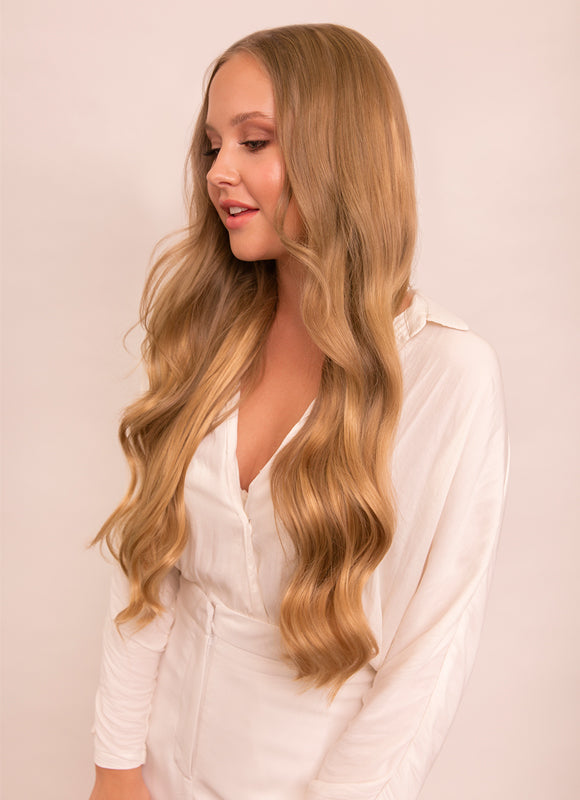 Indulge in the thickest, most luxurious hair extensions we offer — our 24 inch Ultimate Volume Clip-In Hair Extensions in Golden Blonde. Crafted from double drawn, 100% cuticle-aligned Remy human hair, these premium extensions deliver exceptional thickness from top to ends, a soft, silky feel, and stunning, natural-looking volume.